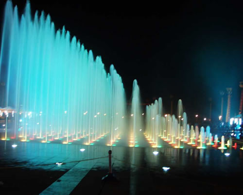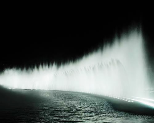 : 由多个一线排列的喷头,按时序控制喷水,构成各种形态喷水瞬间变化的喷泉。可形成跑动形态,还可构成各种跳动、波动等形态,又可以构成固定造型的喷水形态,气势壮大、雄伟,变化多端。
