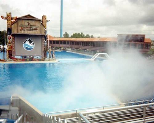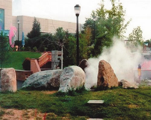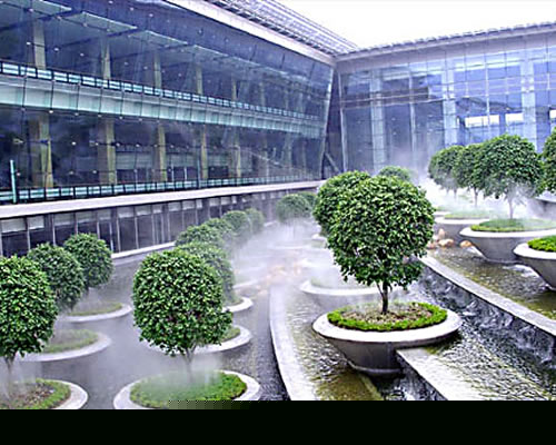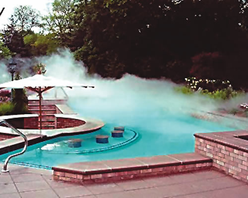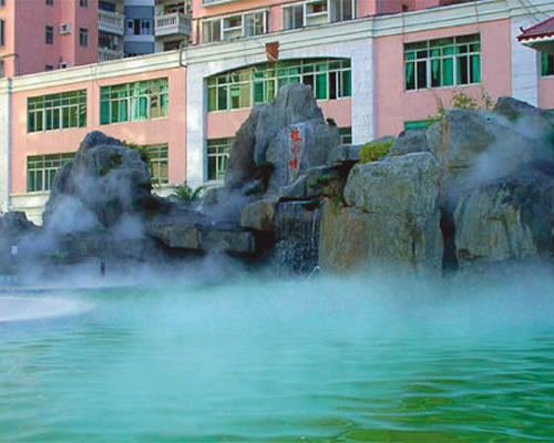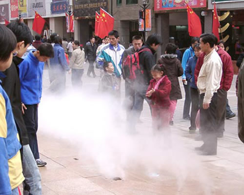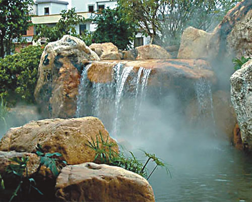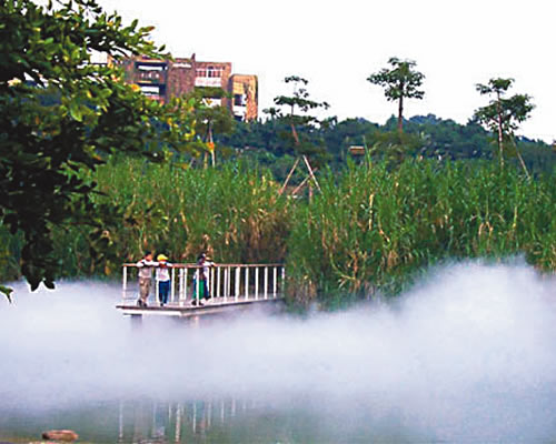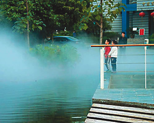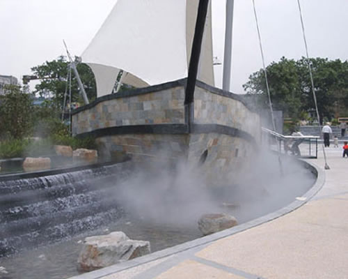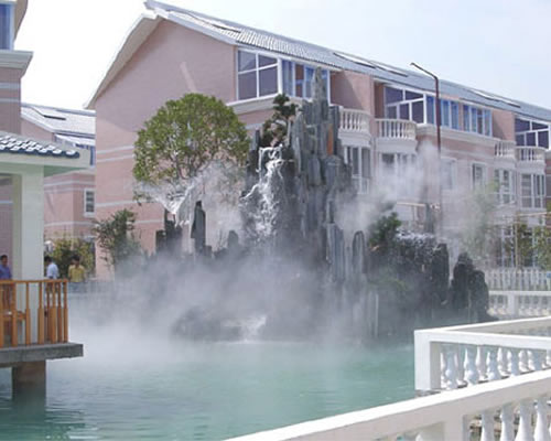 冷雾喷泉: 也称人造雾淡淡的水雾,别有韵致的,轻轻地舒展着妩媚。时而浩浩而来,时而蜿蜓而去,时而高耸如云,时而低回萦绕,使得空气纯净而湿润。而且变化莫测,让人透出阵阵沁人心脾的惬意,如濒临世外仙境,如梦如幻,产生虚无缥缈的梦幻般感觉,从而更增添了几分朦胧之美与神秘之感。干雾似乎能让人在熙攘市嚣中,暂时得以洗涤一身凡俗,舒缓那忐忑不安的心灵,也充分体现了人与自然不可分割的密切关系。雾森设备的应用,塑造了雾森特有的造型及韵味。以略浓的雾掩映了自然堆积状的石形,去除了该区因石多树少而得过硬的人工味,柔化自然景致。淡淡的雾烘托了岩石缝中汩汩流淌的溪流,树荫掩映,小桥流水,朦朦胧胧中感应着自然意境。人造雾不仅可以为您制造出神奇的人文景观,用于广泛的园林景观效果,如主题公园、园林带、假山瀑布、配合各式喷泉、池塘水面、小桥、雕塑等;它还可用于暖房湿度调节、霜冻保护、烟火控制、除尘除臭等,如暖房、孵化场、乳品制场、动物养殖场、砖厂、水泥厂、金属铸造厂、塑料厂以及各种公路收费站的除尘效果;它更可用以降温的效果,为您带来一丝的清凉和舒爽,如室外游乐场、体育馆、室外休闲购物中心、网球场、高尔夫球场等。降温除尘是人造雾最重要的,也是应用得最普遍的功能,特别适应于干热多尘的气候环境以及各种粉尘比较大的场合。总之,人造雾有相当广泛的应用范围,可用于各种不同的特定场合,为您带来意想不到的惊喜和收获。